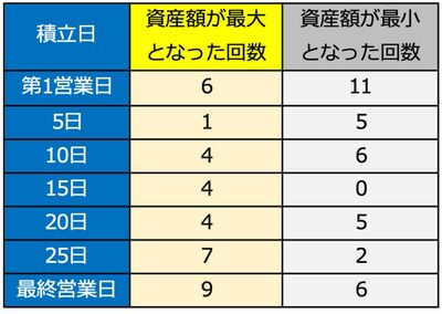<資産総額が一番多い積立日・一番少ない積立日の回数>