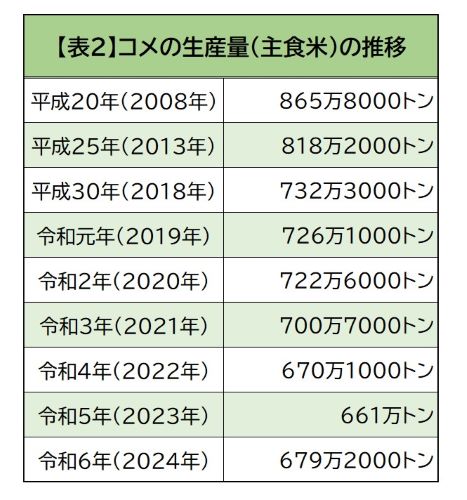 コメの生産量(主食米)の推移を見てみる(別掲【表2】参照)。