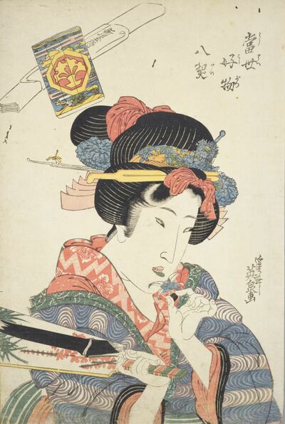 文化・文政期(1804~1829)には、下唇を玉虫色(緑)に輝かせる「笹色紅(ささいろべに)」という化粧法が、江戸と上方の両方で大流行した。