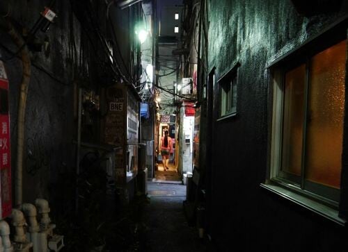 戦後の面影を残す木造長屋の酒横丁・ゴールデン街はもともと非合法の売春を行なうエリア(青線地帯)で建物の2階で娼婦が客をとっていた。
