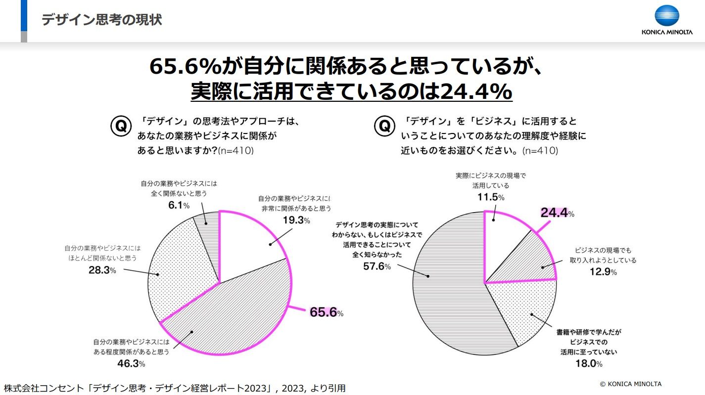 2018年に特許庁が発表した「デザイン経営」宣言では、ブランディングやイノベーションにはデザイン活用が有効だと打ち出された。コニカミノルタのデザインセンターは、まさにブランド構築とイノベーションの両面でデザインの力を活用し、新たな価値の創出に取り組んでいる。コニカミノルタ流「デザイン思考」の考え方や特徴、実践例について、同社のデザイン思考の開発・浸透業務に関わるチーフデザインストラテジストの澤口氏が講演で語った概要をお届けする。
