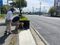 事故現場そばの歩道に花を供える星伸一さん、ひろみさん夫妻(筆者撮影)