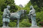 山麓の御殿跡にお約束のポーズで立つ山内一豊と妻(千代)の像
