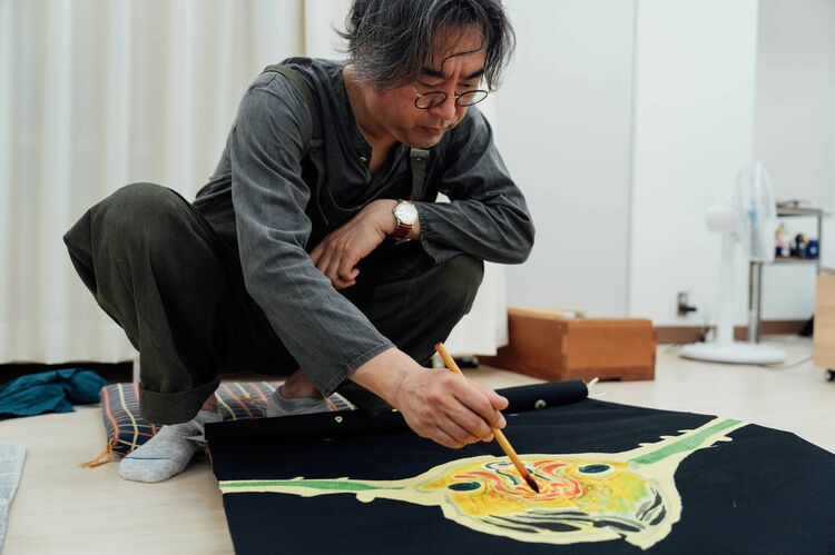 友禅の手描きの場合、私が筆で描くように職人の方たちも絹地に筆で描く。これは同じ手法です。最初は『人がた』も職人さんに描いてもらおうと思ったんですが、何かが上手くいかなくて、直接僕が描くことになったのです。