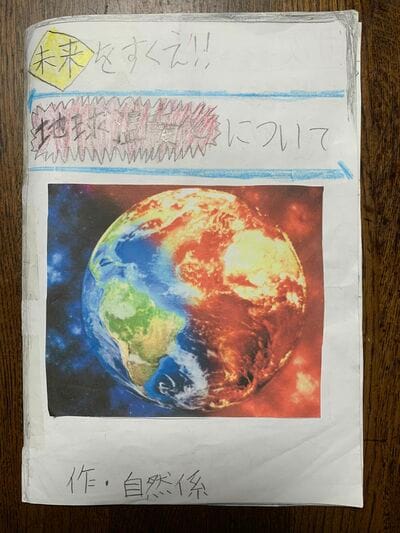 東京都内の小学3年生のあるクラスで3月、児童による手作りの本の発表があった。本のタイトルは『未来をすくえ! 地球温暖化について』。全16ページ。表紙には、赤く変色した地球が大きくレイアウトされ、「地球温暖化」の文字がギザギザの枠で囲まれている。