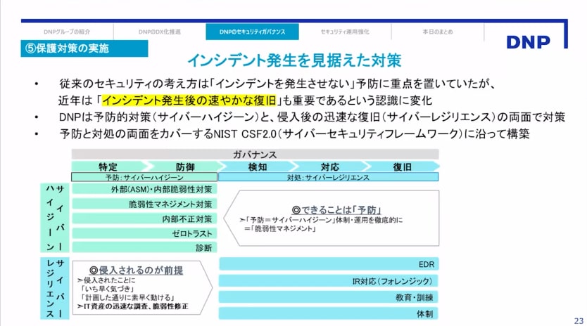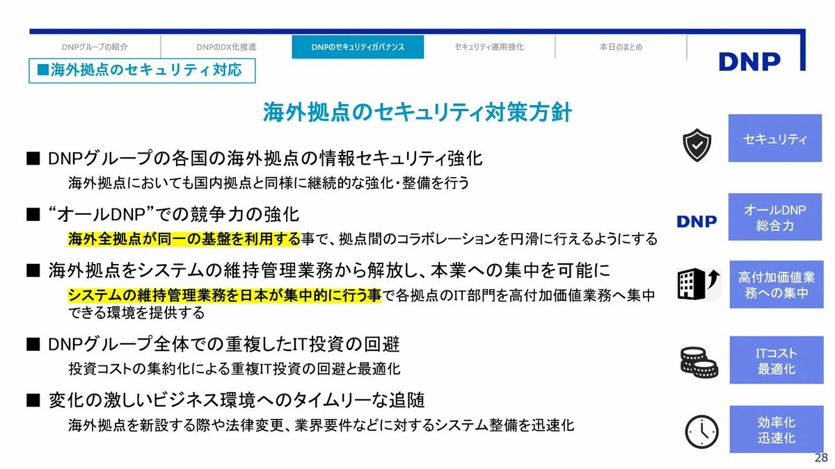 大日本印刷(DNP)グループでは経営基盤としての情報システム強化に取り組むとともに、DXを推進していく上でサイバーセキュリティを重要な経営課題の一つととらえ、対策製品をはじめ人材育成や組織体制等に経営資源を投資しています。DNPグループのセキュリティへの取り組みと、“投資した対策を活かし切る”ためのセキュリティ運用施策についてご紹介します。