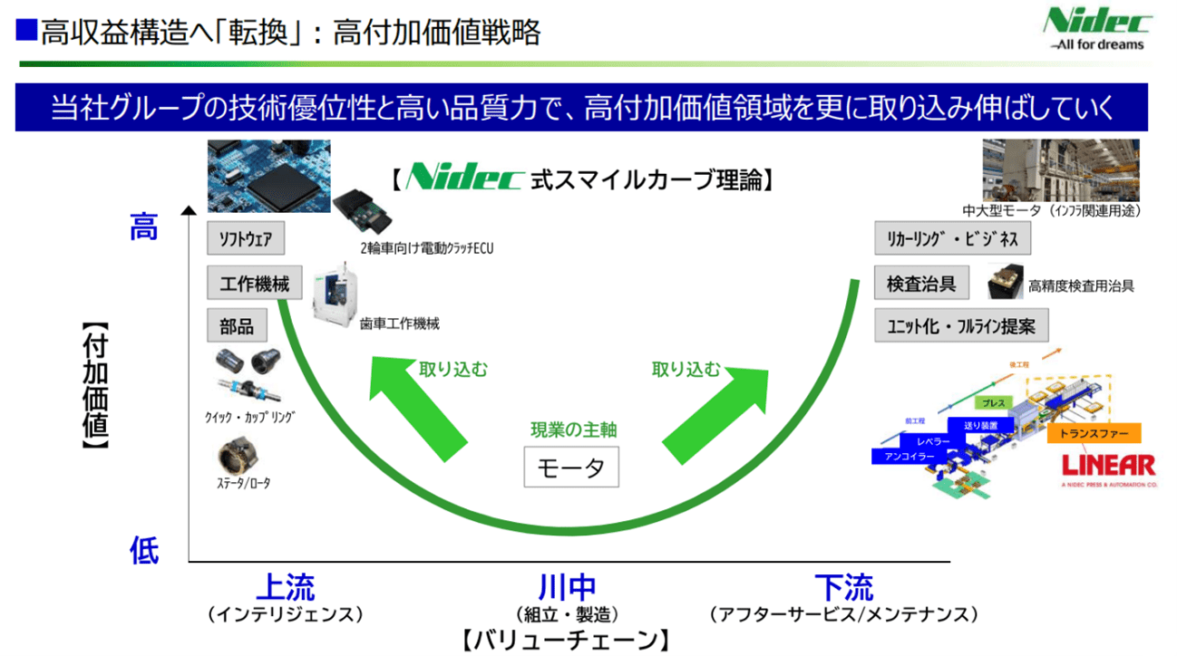 ニデックはバリューチェーンを上流のインテリジェンス、川中の組立・製造、そして下流のアフターサービス/メンテナンスの3つに分けています。この中で、モータが川中に位置し、上流のソフトウェア、工作機械、部品と、下流のリカーリング・ビジネス*、検査治具等を取り込む戦略をとっています。これこそがニデック式スマイルカーブです。
