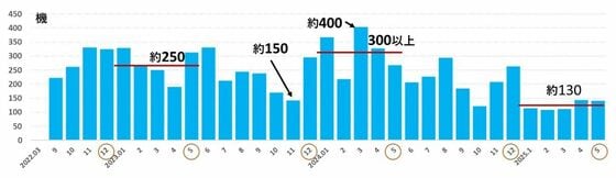 昨年までの月間の回数を見ると、最も多い時期は400発であり、最も少ないのが150発であった。