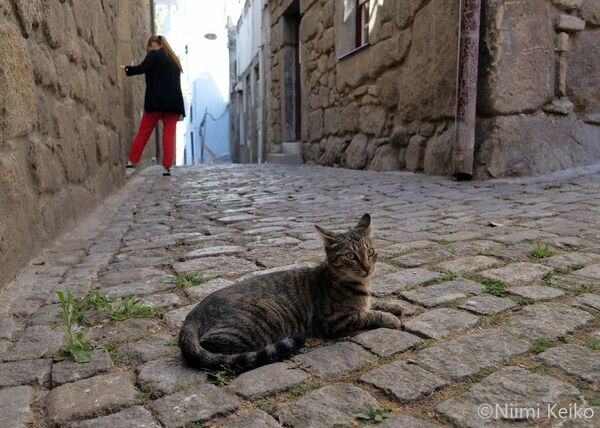住宅地の朝、カフェへコーヒーを飲みに行ったきりの飼い主を待っている猫です。カフェでは、昨夜のサッカーの試合をめぐって紛糾しているのかもしれません。