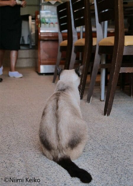 トップの写真で魅力的な色の目を見せてくれた猫の後ろ姿です。猫が店のマダムと話していたので、なにを話していたのか聞いてみると、「階段上の角のおじちゃんが、まだ来てないね。今日は遅いねー」と、言っているとのことでした。