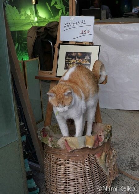 額縁屋の工房の奥から主人が現れて、猫を褒めました。「すごくいい猫。店にいるだけで仕事が楽しいし、お客さんもよろこんでくれるから、この猫には感謝している。名前は、ピルリッツっていうんだ。子猫のときにもらってきて、もう、7〜8年になるけど、子猫の頃のままの愛らしさは変わらない」と、いろいろと話してくれました。