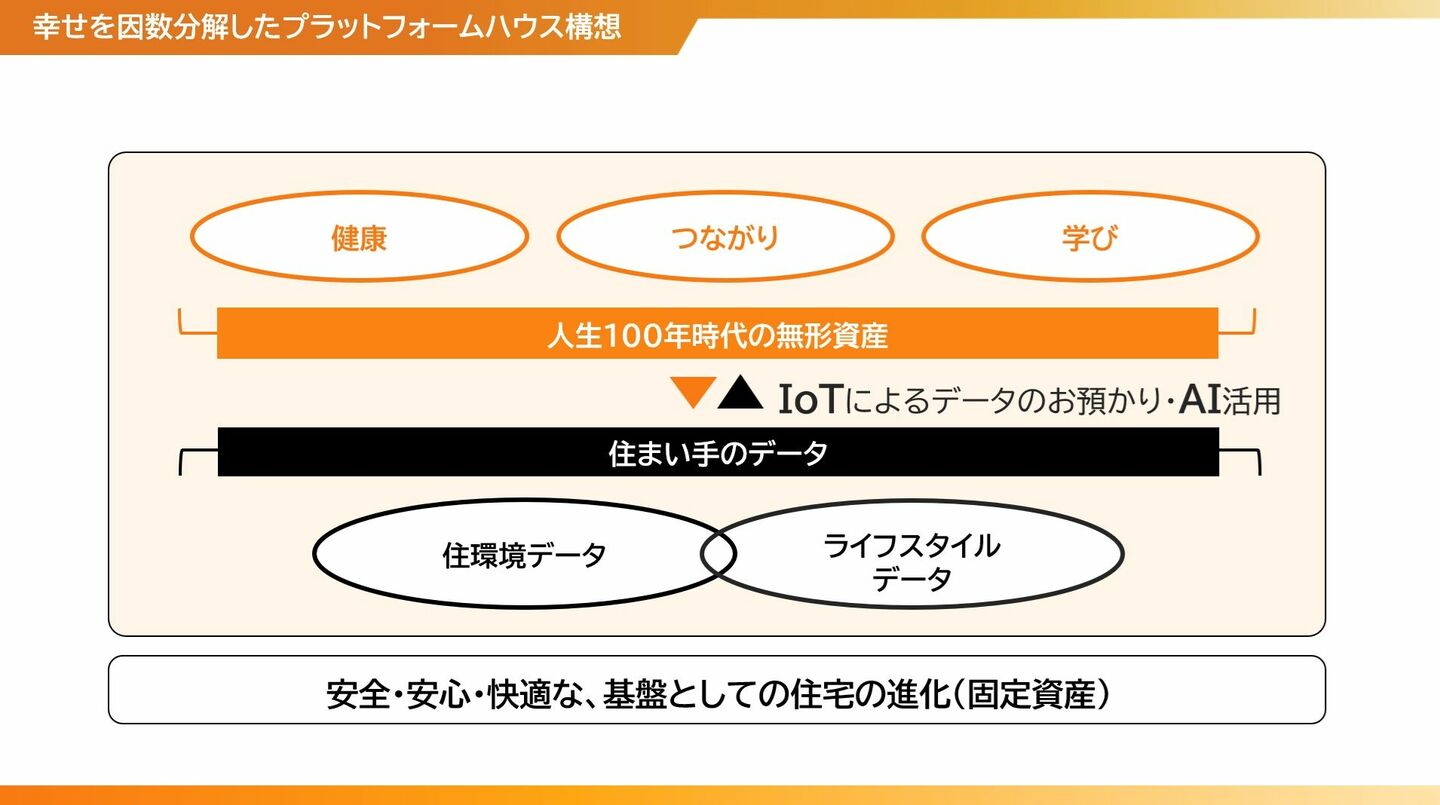 「プラットフォームハウス構想」の中心には、IoTを通して住まいから得られる住環境データとライフスタイルデータがある。これらのデータを組み合わせ、AIを活用してサービス化することで、固定資産としての住まいに健康・つながり・学びといった無形資産を載せていくという(下図)。