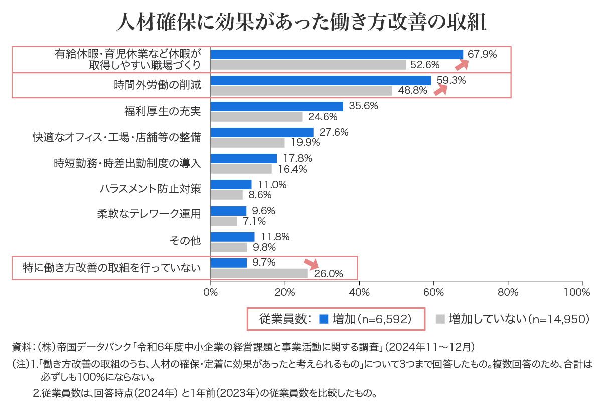 状況が悪化する中、大企業と横一線の採用活動を余儀なくされる実態には変化がなく、人材確保を最大の経営課題と捉える経営者が多いのは当然といえる。白書では、高水準の賃上げによる待遇改善や働き方改革が人材確保に効果的であることがデータで示されており、経営戦略と人材戦略の一体化の必要性も指摘されている。