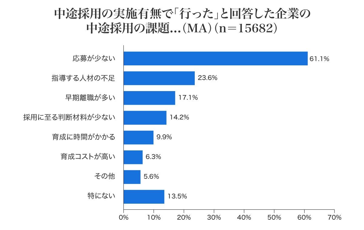 また、募集をしてもなかなか応募が集まらないというのも実態だ。帝国データバンクの「令和5年度中小企業実態調査委託費 中小企業の実態把握に関する調査研究報告書」※注2によると、中小企業が抱える中途採用の課題として最も多いのは応募の少なさだ。応募の少なさはミスマッチの要因となり、早期退職も招きかねない。