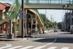 大手門跡。画面右奥に見える木立が本丸で、手前を左右に横切る道路が中山道だ