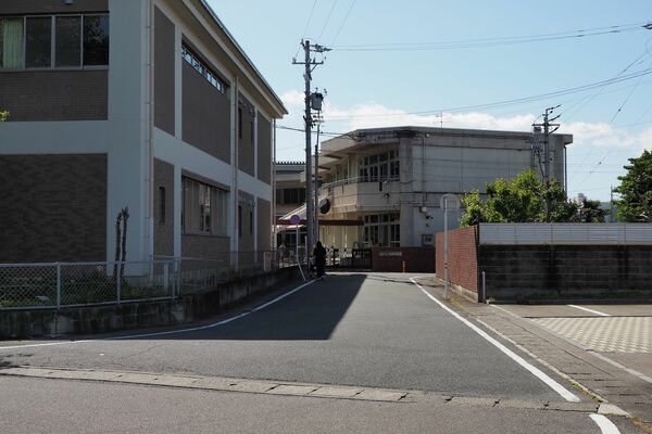 三ノ丸北東隅付近の現況。手前の道路が堀跡で、画面奥の幼稚園敷地内に土塁の一部が残っている