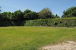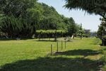 加納城本丸の堀跡。堀は埋められているが、撮影日前日が雨だったため地面には水がしみていた。左手木立の中に石垣が見える