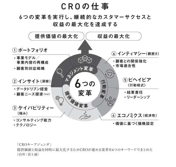これはCRO(最高収益責任者)の仕事の本丸で、顧客フロントのマネジメント変革(ポートフォリオとインサイト〈洞察〉の変革)、社員と役員の行動変革(ビヘイビア〈行動様式〉とインティマシー〈親密さ〉の変革)が主眼です。