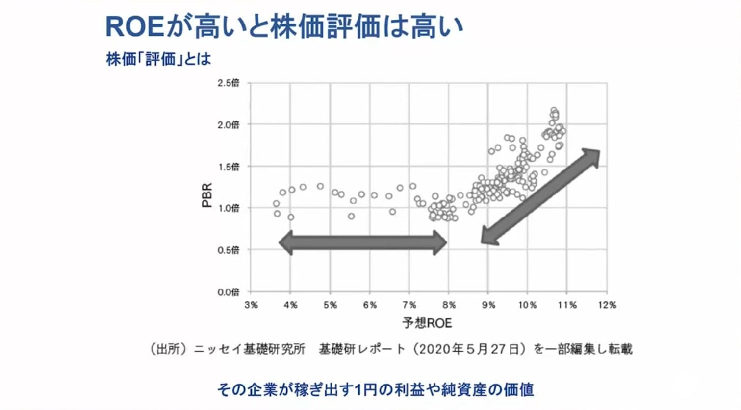 これが何を意味するかと言うと、企業のROEが8%を超えると、株式市場はプレミアムでその企業価値を高く評価する傾向がある、ということです。ですから、経営者はまずはROE8%を目指すことが大切です。