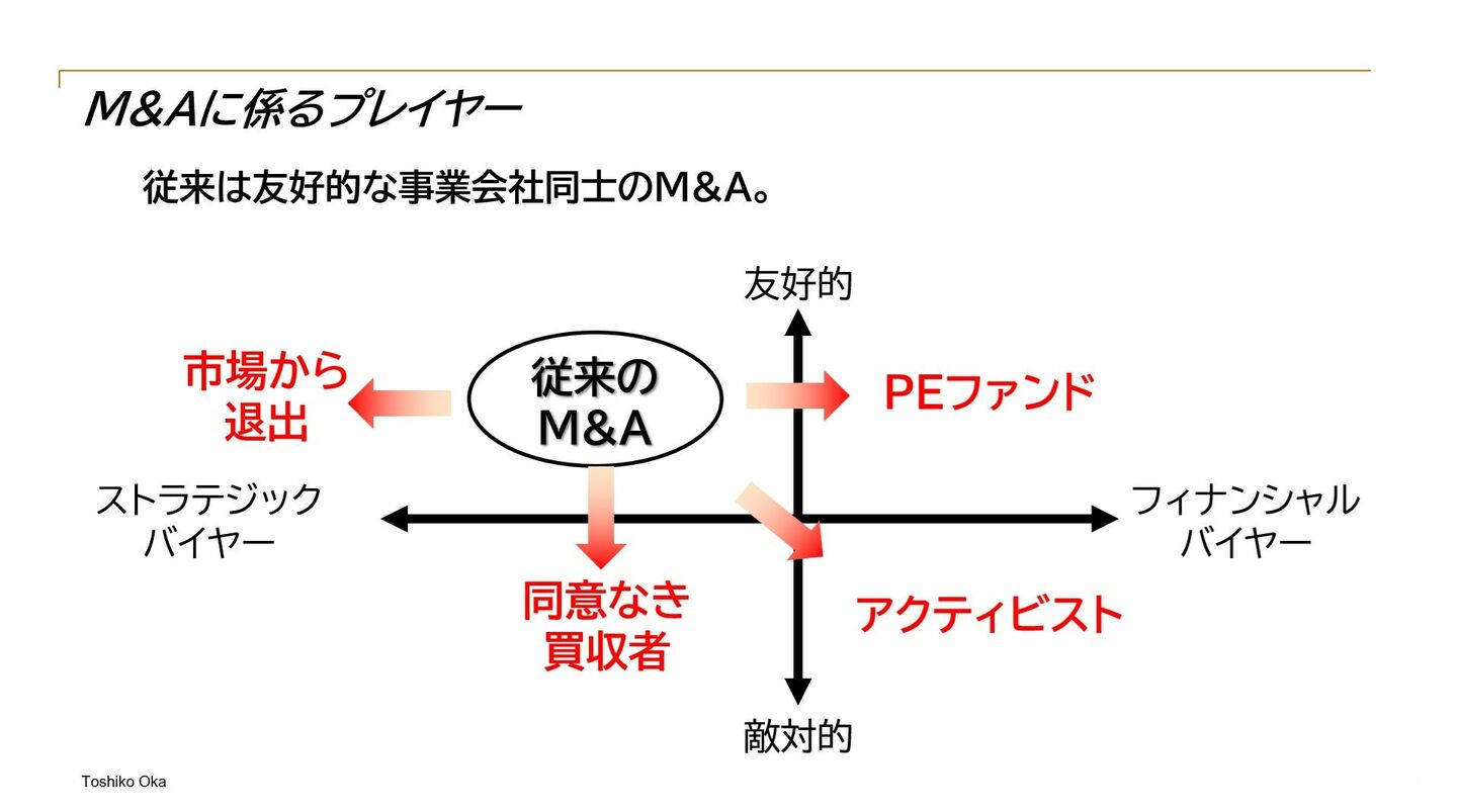 「従来のM&Aでは友好的なM&Aが圧倒的多数でしたが、近年、『同意なき買収』の成功事例が出始めているほか、アクティビストの活動も活発化し、PEファンドのプレゼンスも増大しています」と、M&Aの研究を専門とする明治大学専任教授の岡俊子氏は指摘する。