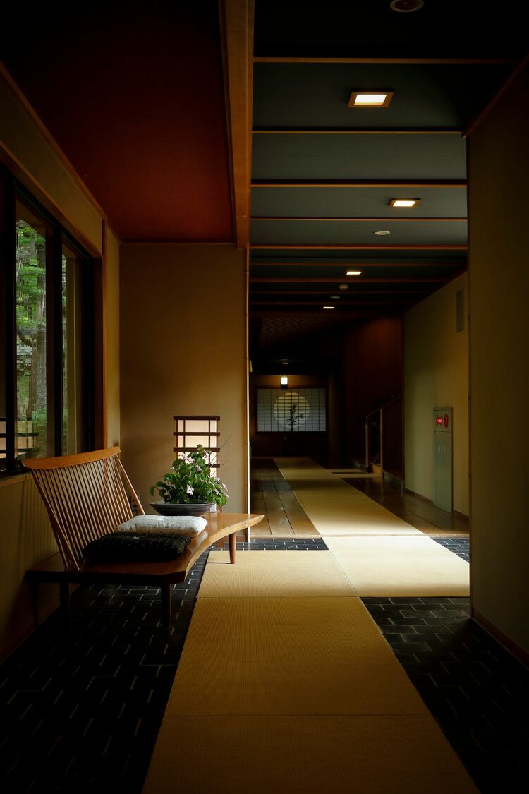 館内のロビー、廊下には、豊かな質感の銘木が使われ、中国の古美術や人間国宝の作品がさりげなく飾られている。廊下は畳敷きになっていて、スリッパを履かずに歩くと、足当たりが心地よい。