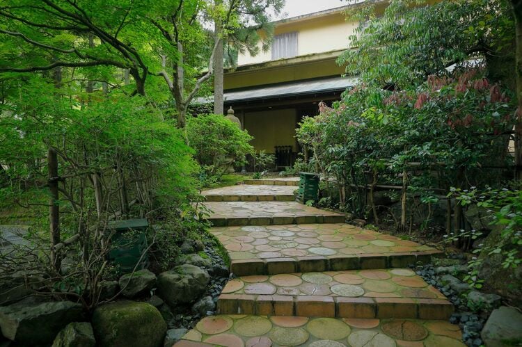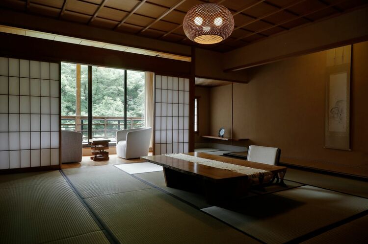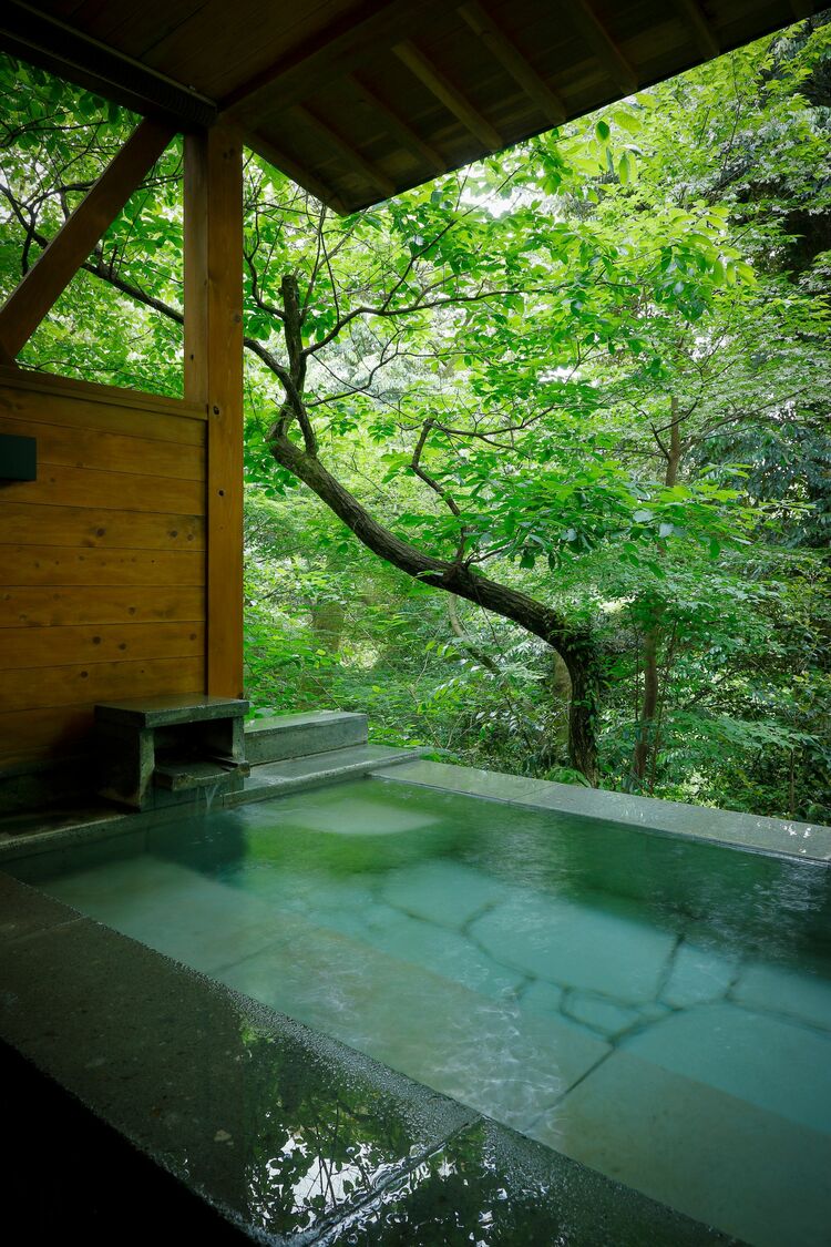 1万坪の敷地に、部屋数はたった10室。全室、自然林の緑に手が届きそうなフォレストビューだ。和室には格式があり、露天風呂には温泉がとうとうと掛け流しされ、渓流のせせらぎが耳に心地よい。