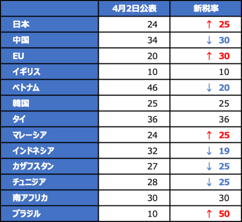 ここで注意したいのは、わずか「1%」とはいえ日本の関税率が引き上げられたことです。というのも、7月9日の猶予期限に前後して多くの国に新しい関税の税率が通知されましたが、報復関税に言及するなどして対決姿勢を鮮明にした一部の国を除けば多くの国が横ばい、ないしは引き下げになっているからです(図表1)。
