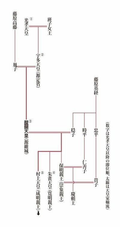 寛明親王は慶頼王が死去した直後の延長三年十月に立太子した。穏子は、延長四年(九二六)六月にも何と四十二歳で第十六皇子成明(なりあきら/後の村上[むらかみ]天皇)を産んでいる。この村上天皇の子孫が、今日まで皇統を継いでいくことになるのである。