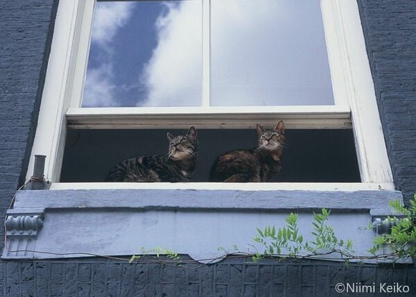 アムステルダムには、窓がいっぱい。そして、猫もいっぱいです。運河沿いの歩道を歩いていて、誰かに見られている?と視線を感じて目をやれば、たいてい猫がいます。目が合った瞬間に視線をそらす猫。こちらの2匹は、同じ方向に目をそらしました。