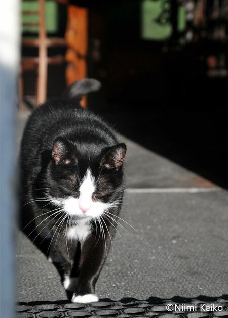 夕方、バーから出てきた猫は、まぶしくて、目を瞑ったまま歩いていました。お客さんは店の中におらず、外の席がにぎわっていたので気になって見にきたようです。