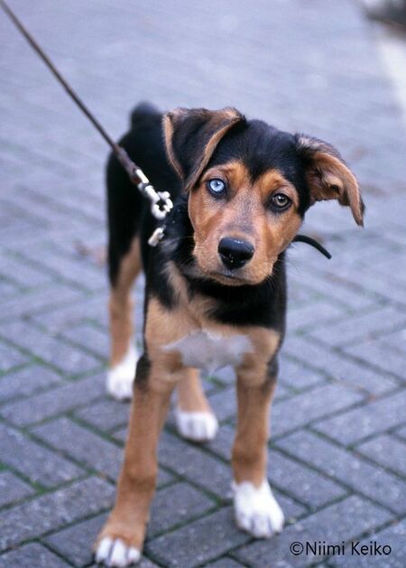 散歩中のオッドアイの幼犬とすれ違いました。動物の保護施設から譲渡を受けた犬なのだそうです。