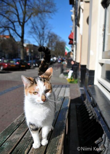 このパン屋さんには喫茶コーナーもあり、店のテーブルがお客さんでいっぱいになったので、店内にいた猫は外へ出てひと休み。さらにお客さんがこのベンチにも腰かけると、店の奥へと引っ込みました。