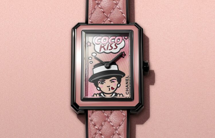 対して「ボーイフレンド BLUSH」のデザインは、ポップアートから想を得たグラフィカルなタッチが楽しい。キュートにウィンクし、投げキッスをするマドモアゼル。文字盤だけでなくベゼル、ストラップも甘いピンクで揃えられていて、ポジティブで明るい気分にさせてくれるウォッチだ。そしてマドモアゼルの黒い瞳には強い存在感がある。