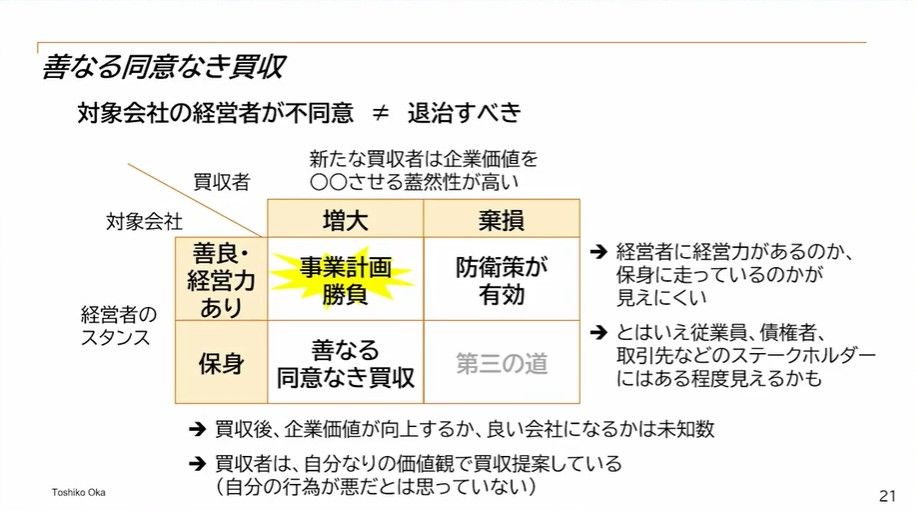従来のM&Aの圧倒的多数は、友好的なM&Aでしたが、近年、「同意なき買収」の成功事例が出初め、アクティビストの活動が活発化しています。1990年代後半の商法改正後、PEファンドの活動量も増大しています。他方、上場企業では「市場から退出する」動きが増えています。本講座では、このような多様化しているM&A取引の動向と、そのM&Aと向き合う際にガバナンスの面からどういう点に留意が必要であるかを解説します。
