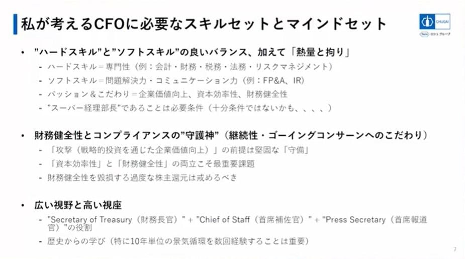 長年のキャリアと経験を踏まえ、CFOの要件と役割について私なりの考えをお話しします。加えて、中外製薬での実例を通じて、”長期的かつ安定的な企業価値向上”と”財務健全性の維持”の両立という基本ミッションに加え、昨今注目されている資本コストを意識した経営について私なりの考え方をお伝えしたいと思います。