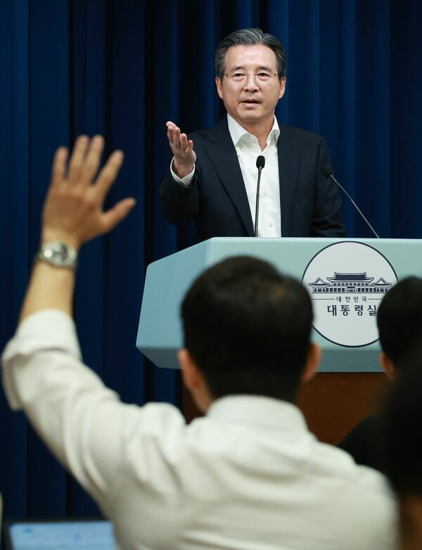2025年7月31日、ソウルの大統領府で行われた記者会見で質問に答える金容範・大統領政策室長(写真:Yonhap News Agency/共同通信イメージズ)