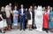 ムーミンはフィンランドの顔。大阪・関西万博でフィンランドのナショナルデーに登場し、ストゥブ大統領(左から5人目)らと写真に収まる(写真:共同通信社)