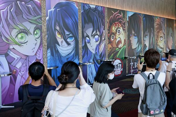 「鬼滅の刃」の最新映画が公開初日を迎え、キャラクターのパネルを撮影する観客ら=7月18日、東京都千代田区の「TOHOシネマズ日比谷」(写真:共同通信社)