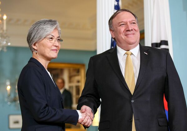 第一次トランプ政権時の2019年3月、ワシントンを訪れ、ポンペ国務長官と会談した韓国の康京和外相(写真:Yonhapnews/ニューズコム/共同通信イメージズ)