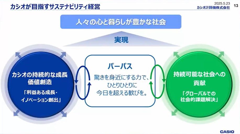 カシオは創業以来、ユーザー目線での社会課題の解決に取り組んできました。2024年には新たにパーパスを策定し、現在はサステナビリティ経営を掲げ、パーパス・バリューズに基づいた事業活動を展開しています。また気候変動への対応としては、SBT・RE100といった国際的なイニシアティブにそった脱炭素戦略を推進。人々の心と暮らしが豊かな社会の実現へ向けたカシオの取り組みを、多角的なアプローチから事例とともに紹介します。
