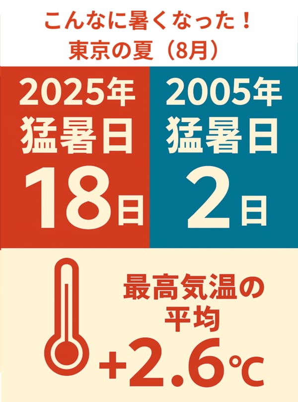 気象庁のデータによれば、東京の年平均気温は過去100年で+3.4℃上昇した。これは日本全体の約+1.4℃よりかなり大きい。夏に限って言えば、2005年7月の東京の最高気温は月平均29.1℃だったのに対し、2025年7月の最高気温の平均は33.2℃。
