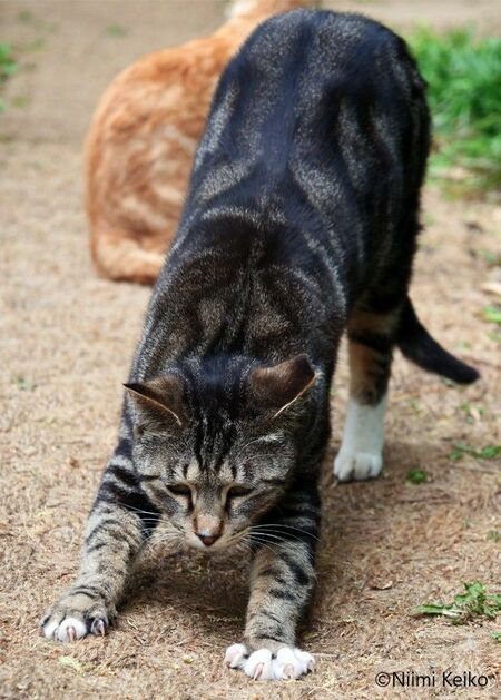 こちらは、散歩している猫同士の挨拶です。お互いにシッポをあげて「ゴッツンコ」しようとしましたが、ちょっとタイミングがずれてしまったようです。こういう場合にゴッツンコのやり直しをすることもありますが、この2匹は、このまますれ違っていきました。