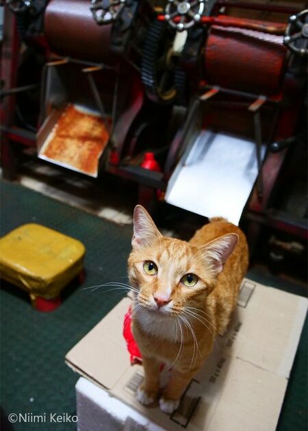 商店街中心地の交差点という好立地にある商店は、片面に靴下やハンカチなどをつるし、片面には海産物の乾物を並べていました。店に入ると小さな作業スペースがあり、「味のしっかりついたやわらかいのしいか」を作る機械が並んでいました。機械の前にいた猫は、その「のしいか」と同じ色をしていました。
