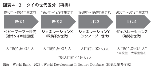 タイのZ世代は2000年以降生まれの現在10代から20代前半で、約1090万人の人口がいます(図表4-3)。2024年時点では学生や就職活動中の経済活動前の人たちも含まれています。
