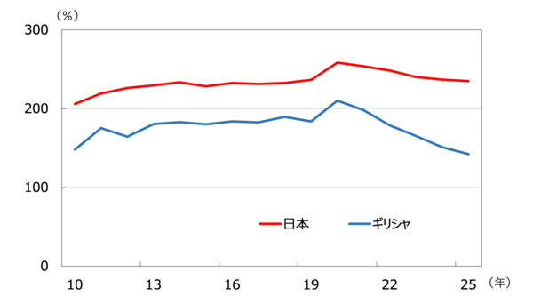 しかし、ギリシャの政府債務の対GDP比は2020年の約210%をピークに低下傾向にあり、2025年には約142%まで低下してきていると推計されています。つまり、こと政府の債務残高に関する限り、日本の状況はギリシャよりも遥かに悪く、引き合いに出すのはむしろギリシャに失礼と言って良さそうです(図表2)。