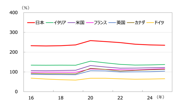 日本の財政といわれてすぐ思い浮かぶのは、巨額の政府債務の存在でしょう。その総額(国、地方、社会保障基金の合計)は2025年4月で約1466兆円、対GDP比で約235%に達し、主要先進国の中では群を抜いて悪い状況にあるとされています(図表1)。