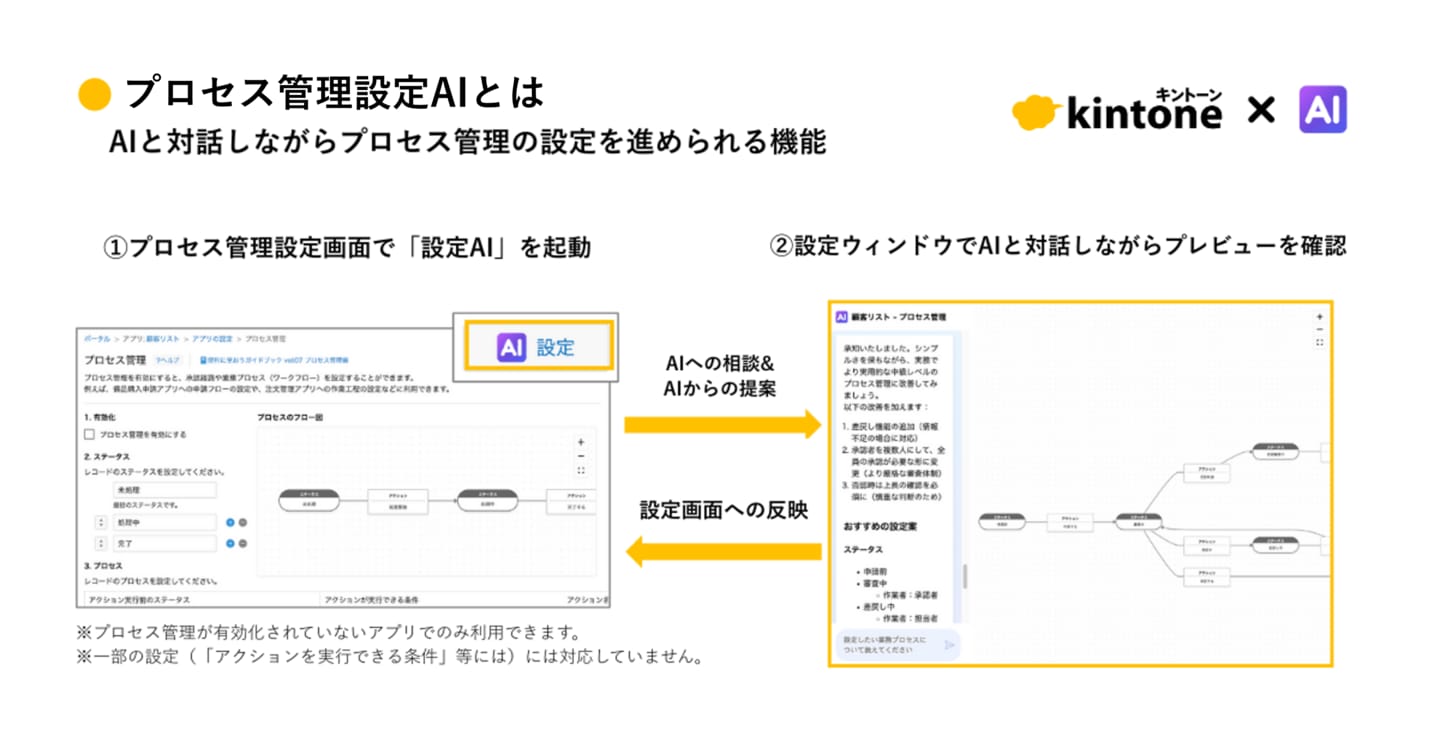 「kintone AIラボ」の3つ目の機能「プロセス管理設定AI」は、その名の通り、実現したい業務プロセス(ワークフロー)をチャットで伝えるだけで、AIが適切なプロセス管理を提案・設定してくれる。