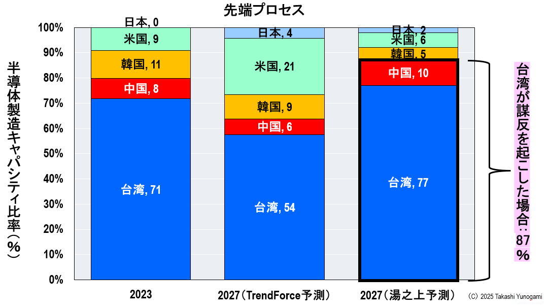 結局のところ、台湾が米国に対して反旗を翻した場合、中国と台湾の合計シェアは、成熟プロセスで83%、先端プロセスで87%に上り、いずれにおいても世界の製造能力を独占支配する構図が成立する。