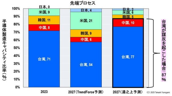 ここで仮に、台湾が米国に対して反旗を翻した場合を想定してみよう。この場合、TSMCは米国アリゾナでの工場建設を中止し、経営難に陥っているインテルへの支援も行わない。こうした前提のもとで再計算された2027年の地域別比率は、台湾77%、中国10%、韓国5%、米国6%、日本2%となる見込みだ。