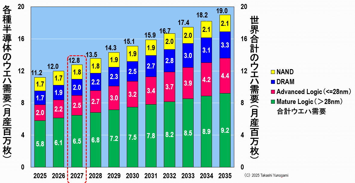 図5は、オランダのASMLが2024年11月14日に開催した投資家向けセミナーで公表したデータを基に、2025年から2035年までの各種半導体におけるウエハ需要を予測したものである。